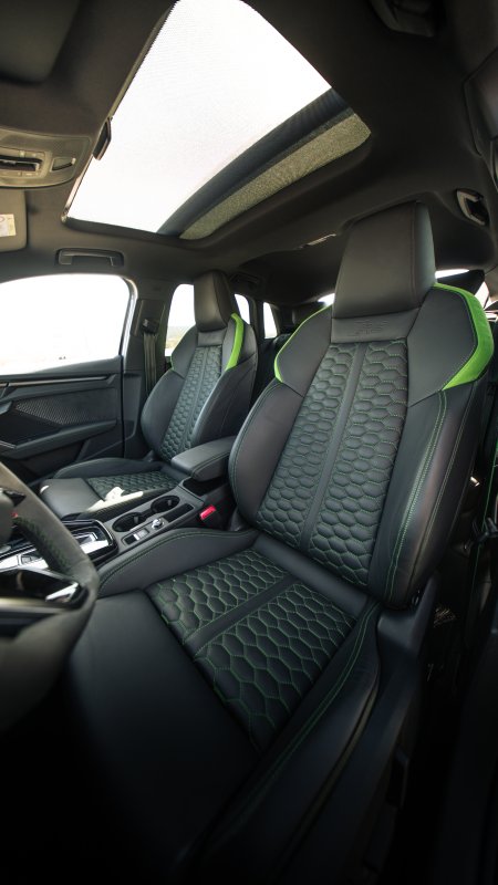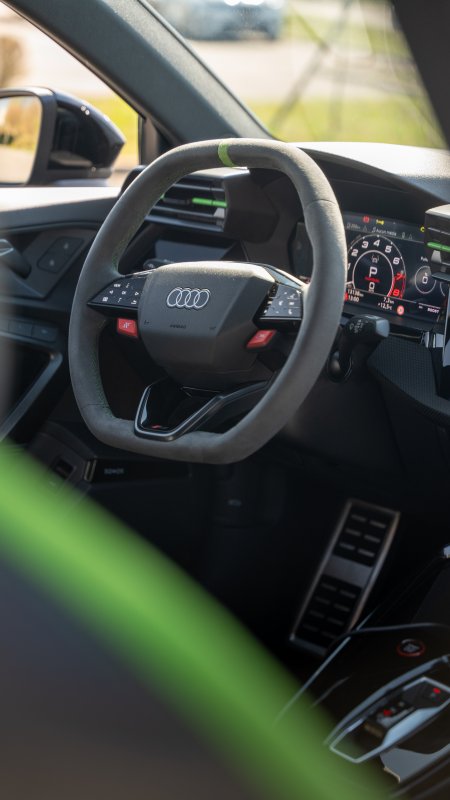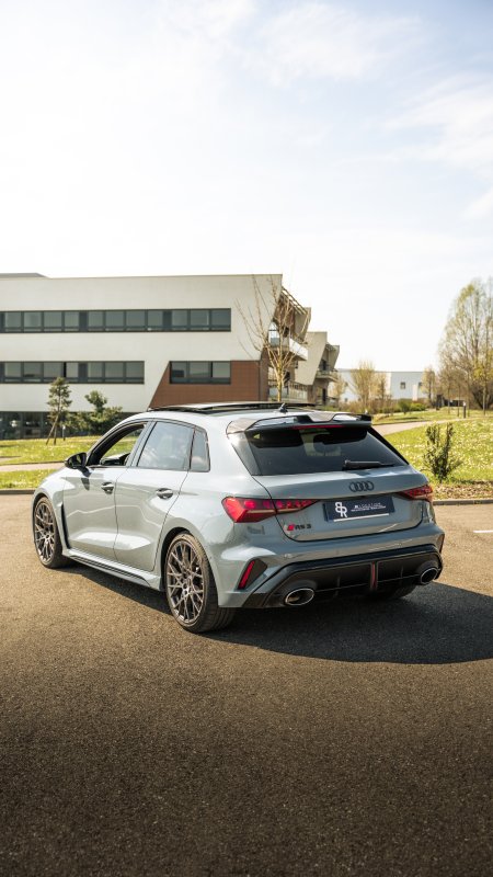 L’Audi RS3 Sportback facelift 2026 gris Kemora incarne une compacte ultra-sportive au design affûté. Sa teinte gris bleuté métallisée sublime la large calandre Singleframe noire, les prises d’air sculptées et les jantes 19 pouces. À l’arrière, le diffuseur imposant et les feux redessinés renforcent son agressivité, tandis que les éléments noirs et les détails carbone accentuent son style premium et dynamique.